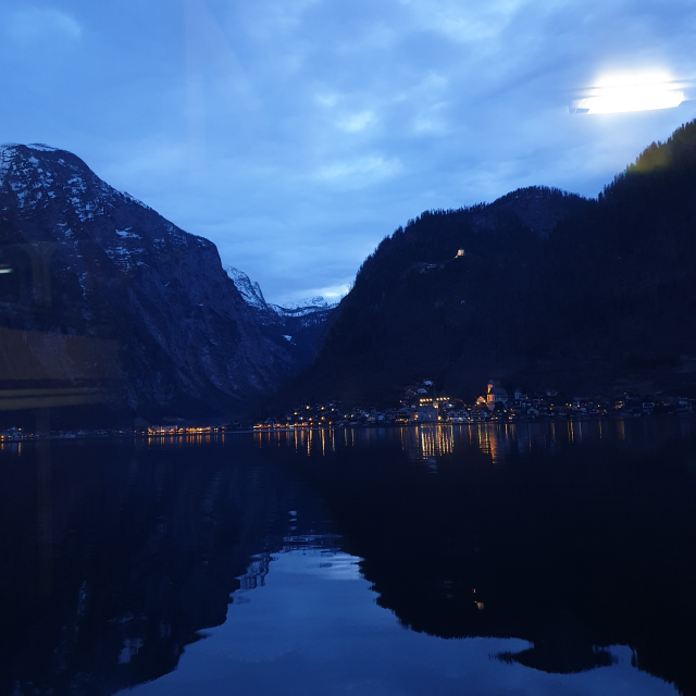 할슈타트로 복귀하는 페리에서 야경사진을 찍어봅니다. 너무 추워서 야외에서는 못 찍었고, 페리 실내에서 유리창 밖을 찍어 화질이 그렇게 좋지는 않네요..
