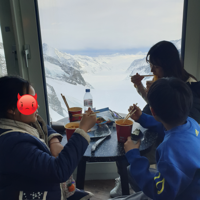 융프라우의 랜드마크인 간판앞에서 사진 한장 찍어줍니다. 이제는 아이들이 기다리고 기다리던 신라면을 먹는 시간이 왔습니다. 고원 지대는 너무 추워서 오랜시간 동안 있을 수 없었습니다. 바로 실내로 들어와서 카페테리아에서 신라면을 주문합니다. 우리가 구매한 교통권을 보여주면 직원분이 알아서 주십니다.