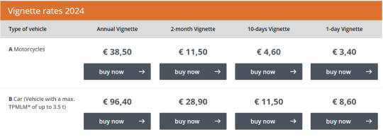 비넷은 1년 이용권, 2달 이용권, 10일 이용권, 1일 이용권이 있습니다. 일반적인 차량기준으로 2024년 1년 권은 96.4 EUR, 2달 권은 28.9 EUR, 10일 권은 11.5 EUR, 1일 권은 8.6EUR 입니다.